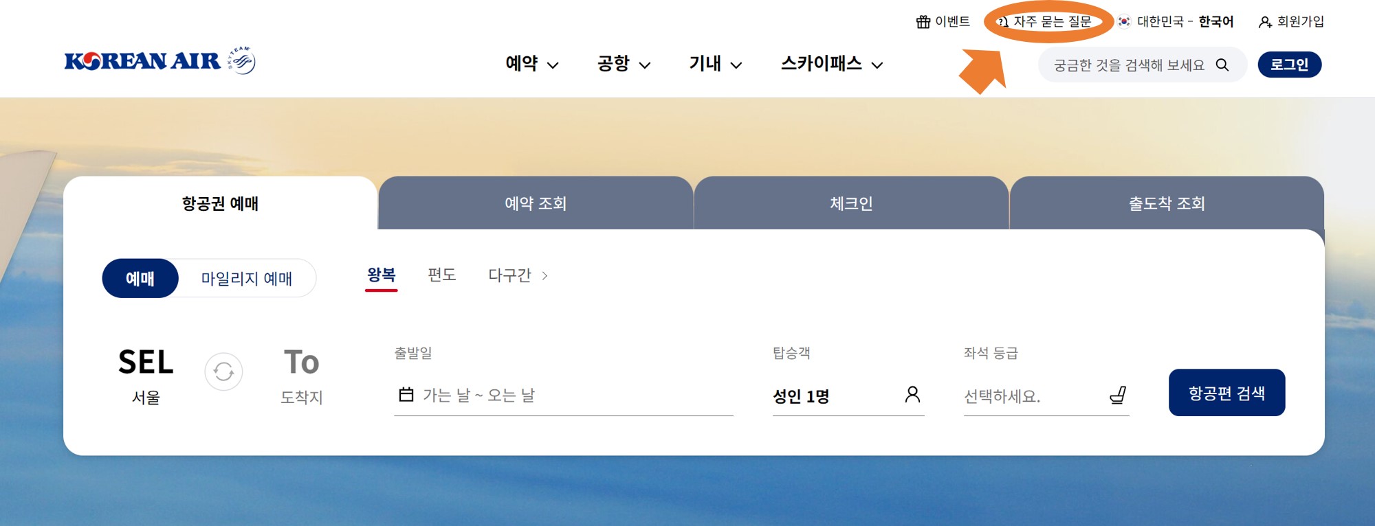 아래 자주묻는질문자주 묻는 질문 바로가기에서도 지금 바로 대한항공 홈페이지 - 자주 묻는 질문을 이용할 수 있습니다.