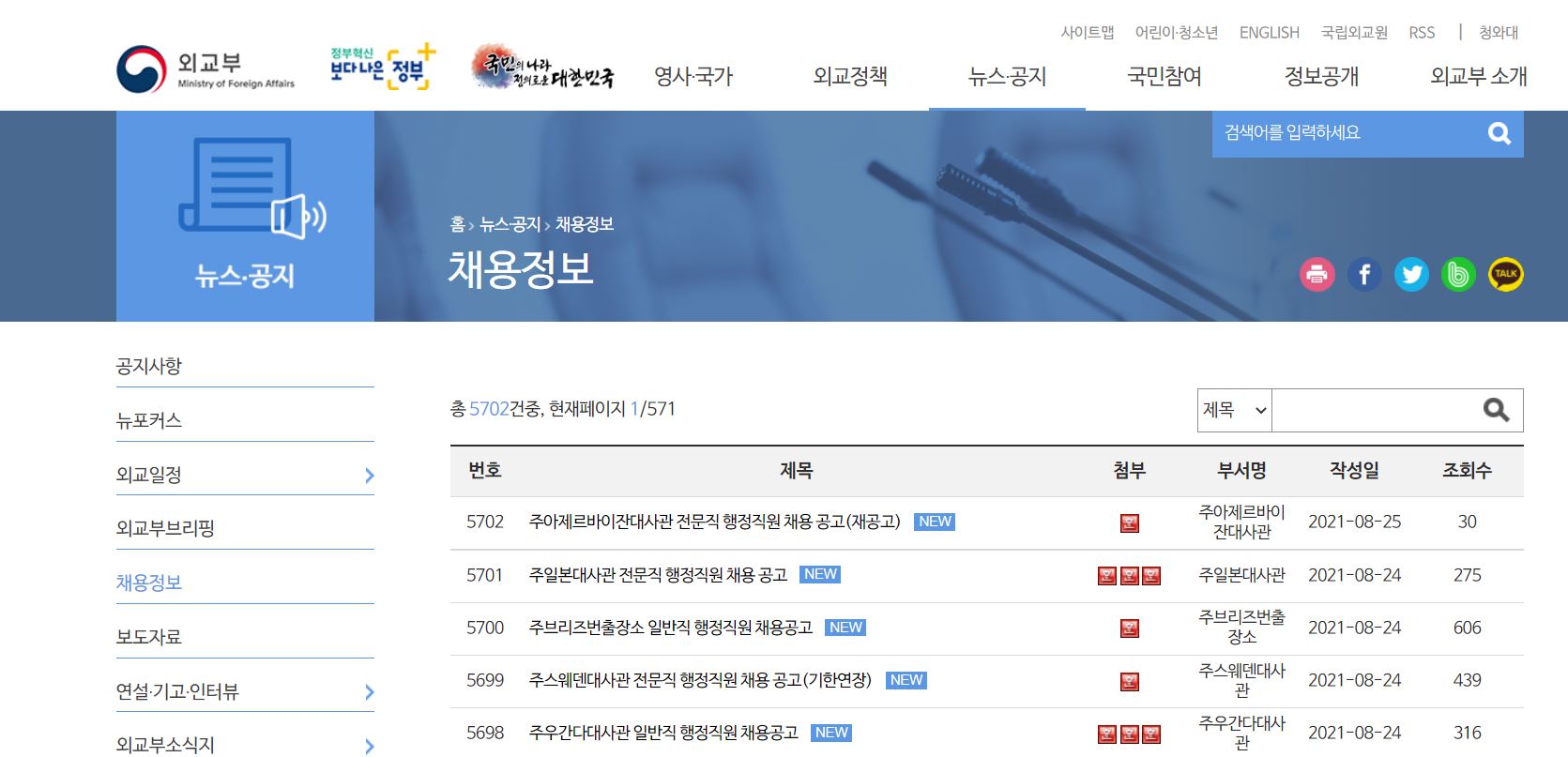 외교부 채용정보가 있습니다. 행정직원 임시직 일반직 관저요리사 등 외교부에서 채용하는 공고가 정리되어 올라오니 필요하신 분은 홈페이지에서 확인하면 도움이 될 것입니다.