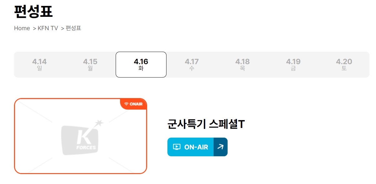 국방 tv 홈페이지에 가면 편성표를 확인할 수 있고 온에어 바로가기에서는 실시간으로 프로그램을 시청할 수 있습니다. 아래 그림을 터치하면 온에어 바로가기로 이동합니다.