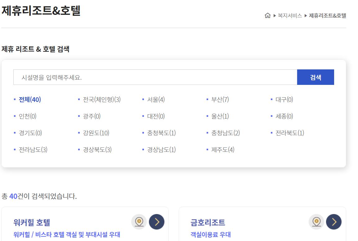 이용을 원할 시 예를 들어 회원전용 리조트를 선택하면 아래와 같이 이용가능한 리조트와 예약방법 전화번호 등에 대한 설명이 나와 있습니다. 검색 시 전체로도 검색이 가능하고 시설명 입력 후 검색 또는 지역별로도 검색이 가능하니 편한 방법으로 이용하면 됩니다. 다른 복지서비스도 마찬가지로 동일한 방법으로 이용 가능합니다.