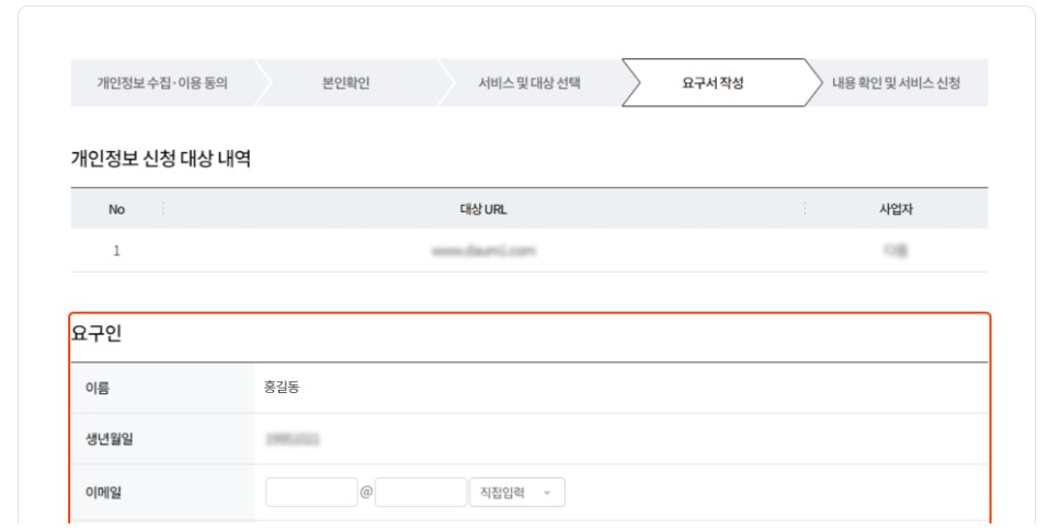 1) 이메일주소 2) 휴대폰 번호를 정확하게 입력한 후 다음단계를 클릭하여 서비스 신청을 합니다.