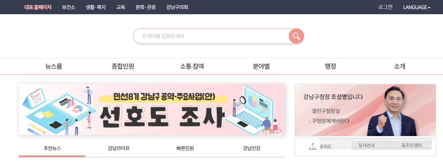 강남구청 홈페이지는 평소 이용하는 포털 검색창에 "강남구청"을 타자를 친다음 검색창에 입력한후 검색버튼을 누르면 상단에 홈페이지 주소가 나오는데, 아닌경우도 있어 아래 링크를 첨부했으니 강남구청 홈페이지 바로가기 링크를 통해 접속하시면 편리합니다. 아래 사진은 강남구청 홈페이지 첫화면입니다.