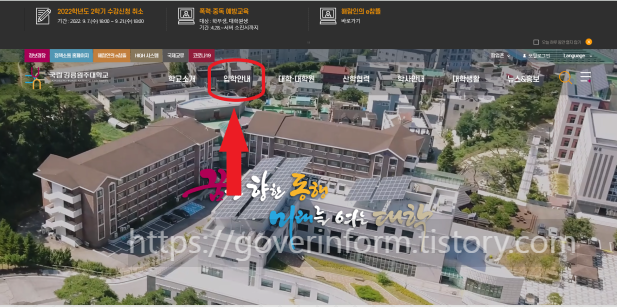 강릉대 입학처 홈페이지 접속방법입니다. 강릉대 홈페이지에 접속한다음 홈페이지 첫화면에 "입학안내"라고 되어있는 부분을 클릭하면 됩니다.
