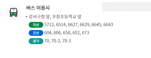 지하철 이용시 화곡역, 발산역, 가양역, 염창역을 이용하고 버스 환승을 하면 10~20분 이내에 강서구청에 도착합니다. 강서구청에서 제일 가까운 버스정류장은 강서구청앞 또는 우장초등학교 앞입니다.