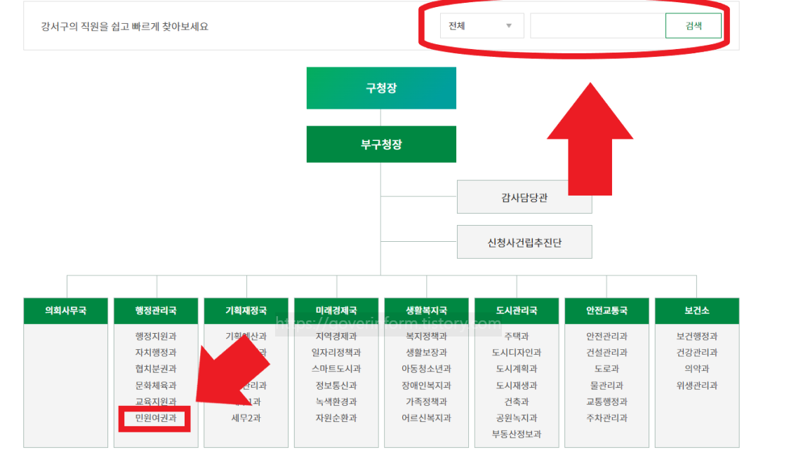 강서구청 조직도는 다음과 같으며, 조직도 전체보기를 하면 직원 검색을 할수 있습니다. 직원검색시 직원명을 몰라도 원하는 부서만 선택하면 담당업무와 직원명 전화번호까지 조회할수있습니다. 민원여권과도 많은분들이 찾는 부서인데, 해당부서에 대한 정보도 조직도 전체보기에서 볼수 있습니다.