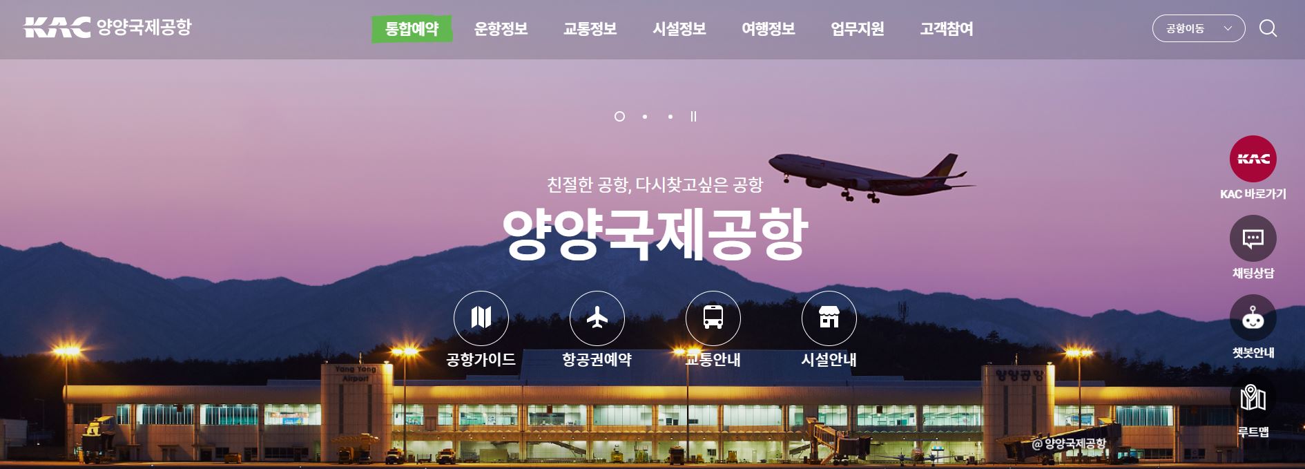 강원도에 양양국제공항도 있다. 강원도 양양군 손양면 공항로 201에 양양국제공항이 있다. 양양국제공항 홈페이지에는 공항 시설안내, 전화번호 안내, 공항이용 알짜팁, 공항오기전 대중교통, 공항에서 탑승수속, 수하물 수취등에 대해 자세하게 알려주고 있다.