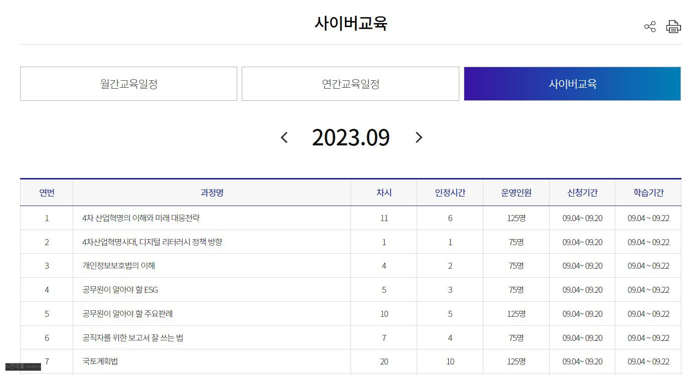 이곳에는 교육안내, 교육센터, 교육자료실, 소통마당, 공무원교육원 소개 메뉴가 있습니다. 1) 교육안내에는 교육일정과 교육운영에 관한 내용이 있습니다. 2) 교육센터에는 사이버 배움터 교육 안내와 신청, QR출석, 근태신청(외출 및 외박 신청 바로가기), 과정 설문응시, 강사신청이 있습니다.