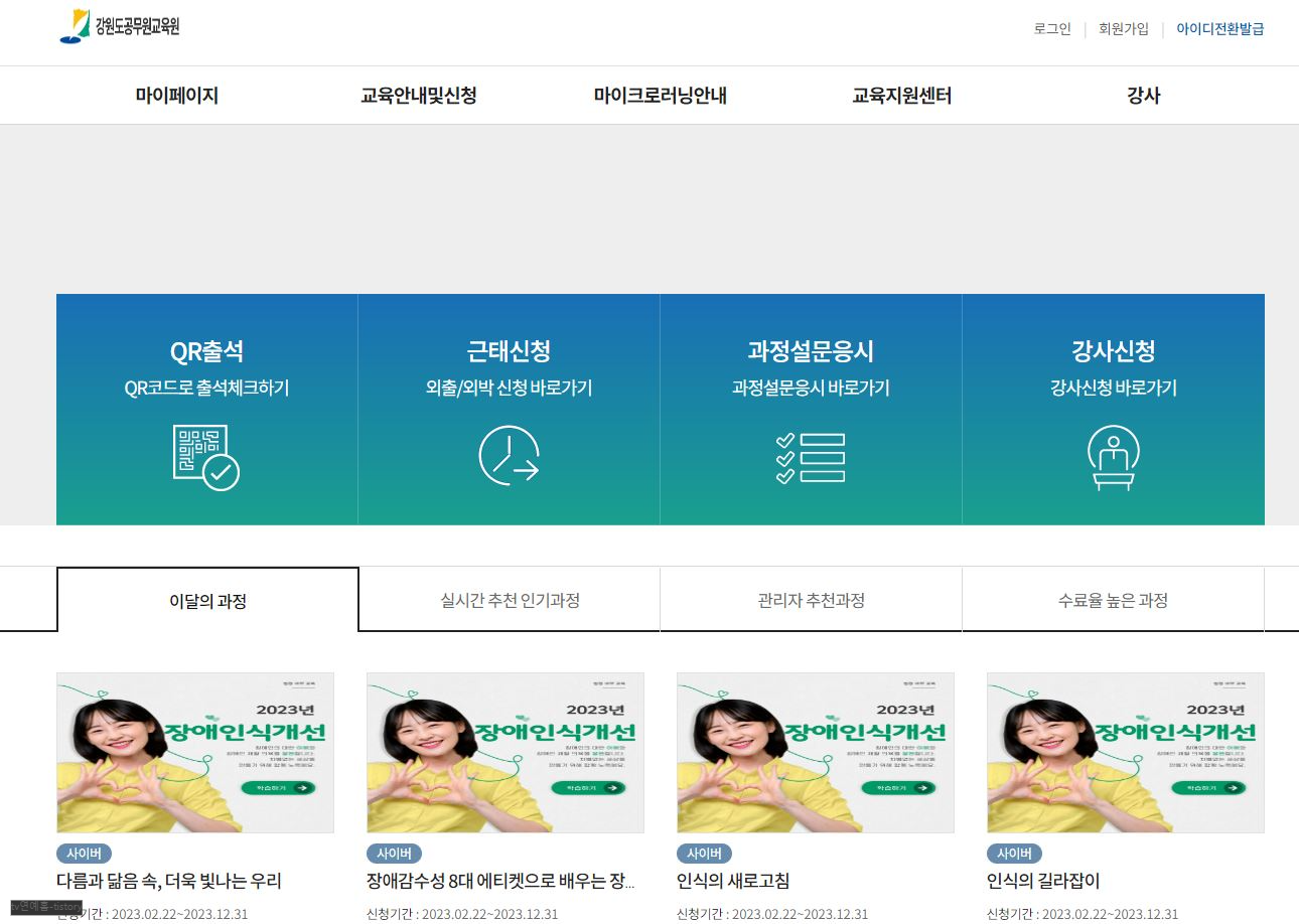 여기에서는 강원도 공무원 교육원 홈페이지 바로 이용하기 그리고 홈페이지에서 볼만한 유용한 정보를 제공하고자 합니다. 이용관련하여 문의사항은 아래 댓글창에 남겨주시기 바랍니다.