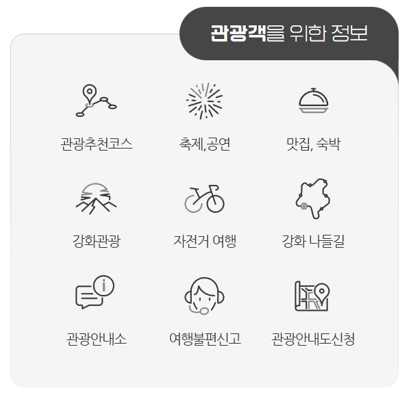 강화군관광소식에는 관광 추천 코스, 축제/공연, 맛집/숙박, 강화관광, 자전거 여행, 강화 나들길, 관광안내소, 관광안내도신청이 있습니다.