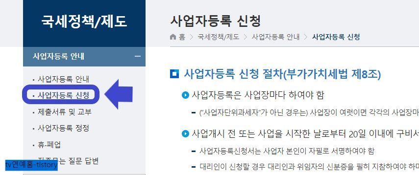 4) 3)을 읽고 좌측 사업자등록 안내> 사업자등록 신청순으로 접근합니다. 사업자등록은 사업장마다 하여야하며 사업개시 전이나 사업시작 후 20일 이내에 신청해야 합니다. 사업자등록신청서는 사업자 본인이 자필 서명해야 하며 대리인이 신청은 가능하나 필요 서류가 있으며 이는 부가가치세법 제8조에 따른 내용이므로 사업자등록 신청 시 반드시 지켜야 할 의무입니다.