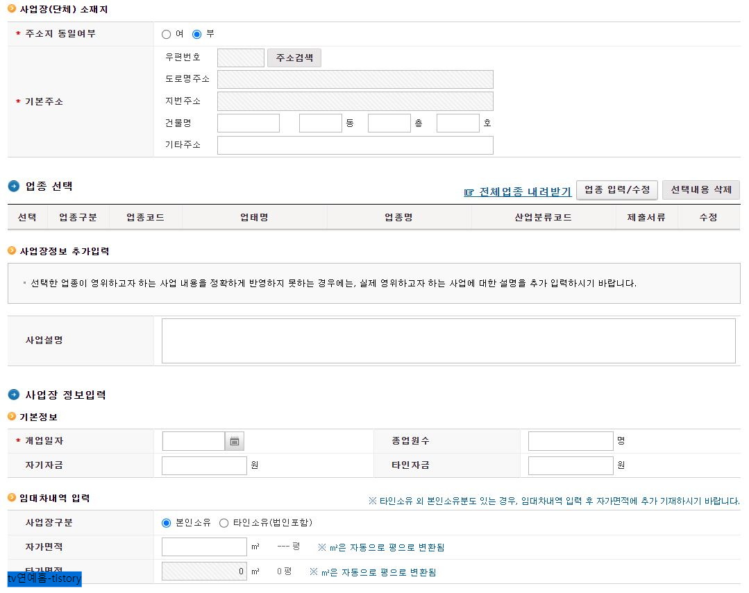 8) 기본인적사항 + 사업장(단체) 소재지, 업종선택, 사업장 정보를 입력합니다.
