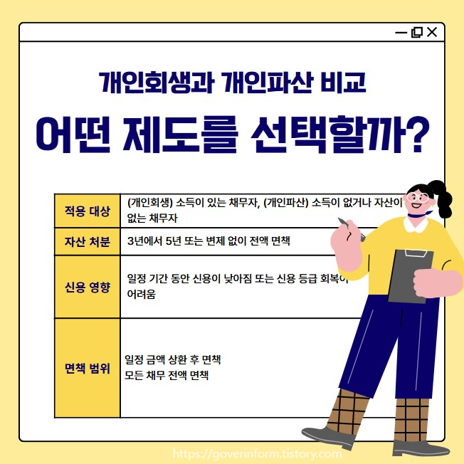 개인회생과 개인파산은 채무가 과해져 더 이상 상환이 불가능할 때 선택할 수 있는 두 가지 주요한 법적 절차입니다. 그러나 이 두 가지 절차는 법적 효력, 신청 자격, 자산 처분, 변제 기간, 신용 영향 그리고 면책 범위 면에서 큰 차이가 있습니다. 오늘은 개인회생과 개인파산의 차이점과 각 절차의 특징을 비교해 보겠습니다. 포스팅 하단에 있는 '어떤 제도를 선택할까?'를 보고 자신에게 맞는 방법을 선택하세요.