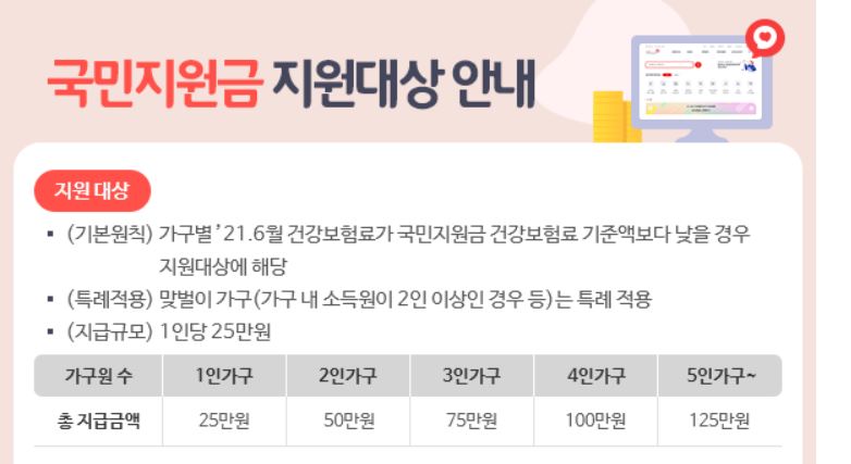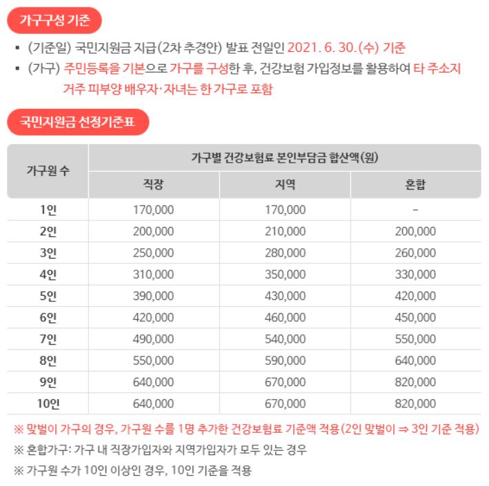 지원대상은 건강보험료 기준액입니다. 가구원수에 따라 다릅니다. 가구 구성 기준은 아래 표를 확인해주세요.