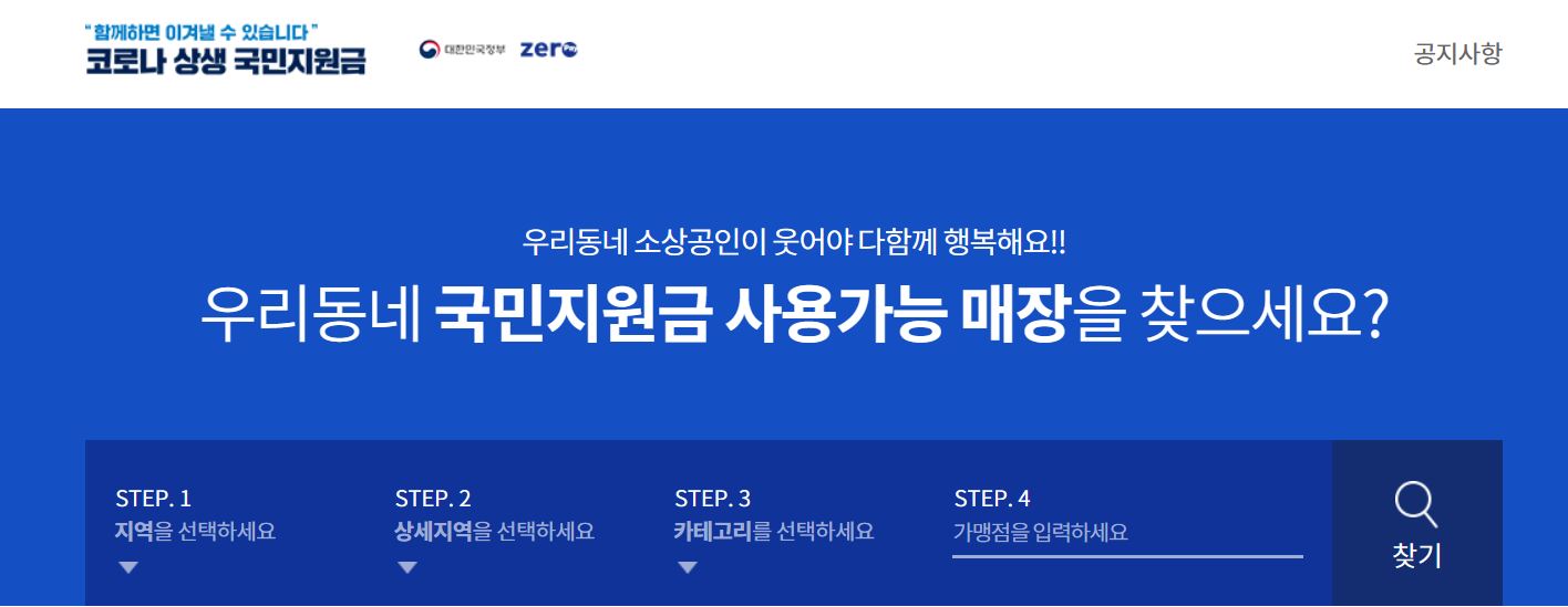 신청이 완료되면 다음날 카드에 충전이 되는 형식입니다. 카드가 없는 경우 주민센터에서 선불카드나 상품권으로 받을 수 있습니다. 국민지원금 사용처는 아래 홈페이지에서 확인 가능합니다. 시장 병원 주유소 의류 학원 등에서 사용가능합니다.