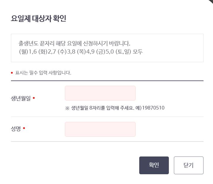 자신의 정보를 입력한 뒤 조회가 가능합니다. 요일제가 적용되니 확인해주세요. (월) 1,6 (화) 2,7 (수) 3,8 (목) 4,9 (금) 5,0 (토, 일) 모두입니다.