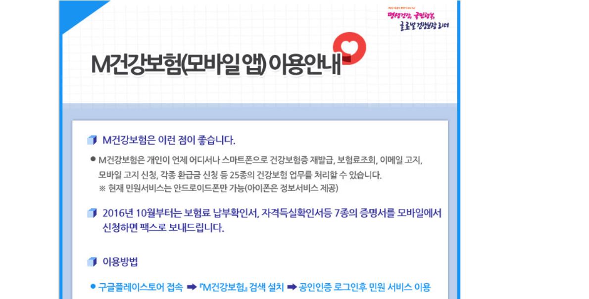 M건강보험 앱 설치>앱 상단 민원서비스 터치> 증명서 팩스발송 터치> 주민등록번호 입력후 공인인증서 로그인> 팩스 전송 순으로 이용할 수 있습니다.