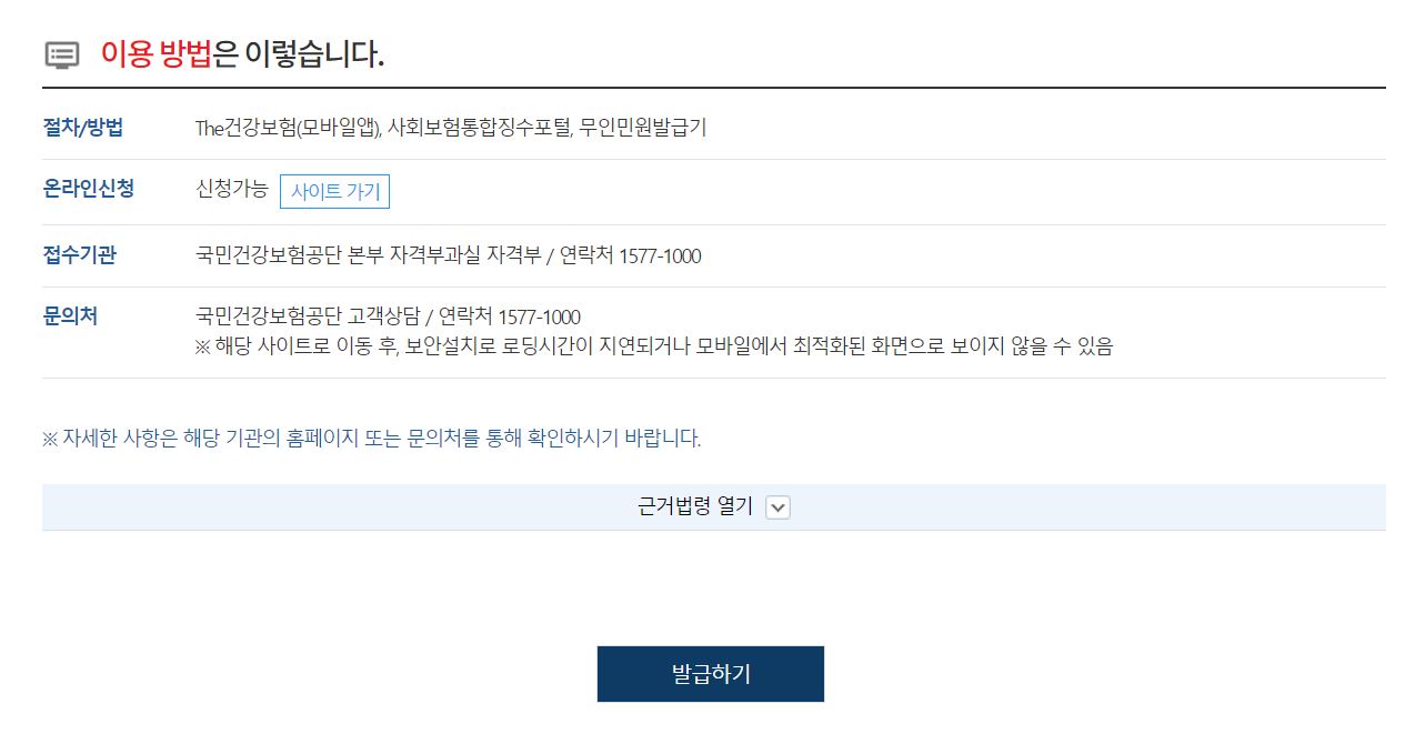 3. 해당 아이콘을 클릭하면 다음과 같이 건강보험 발급하기 버튼이 나옵니다.