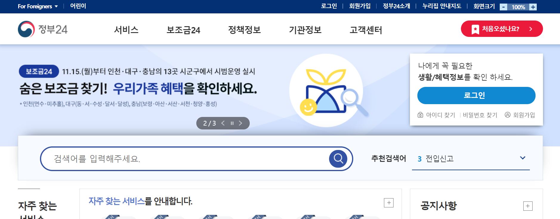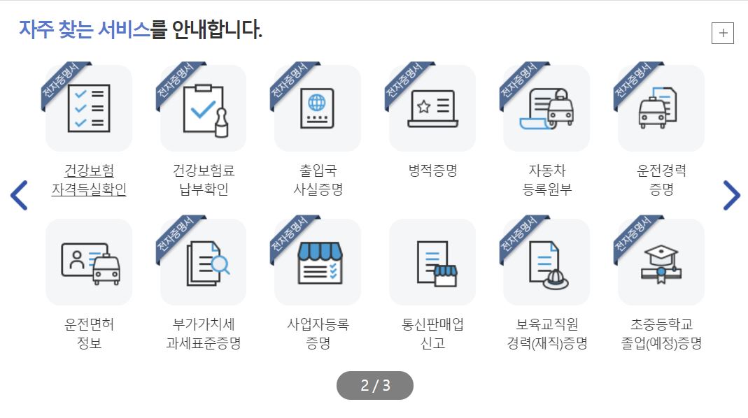 1. 먼저 정부24 홈페이지에 접속하면 다음과 같은 화면이 나옵니다. 바로 건강보험 자격득실 확인서 발급하는 아이콘이 보이지 않습니다.