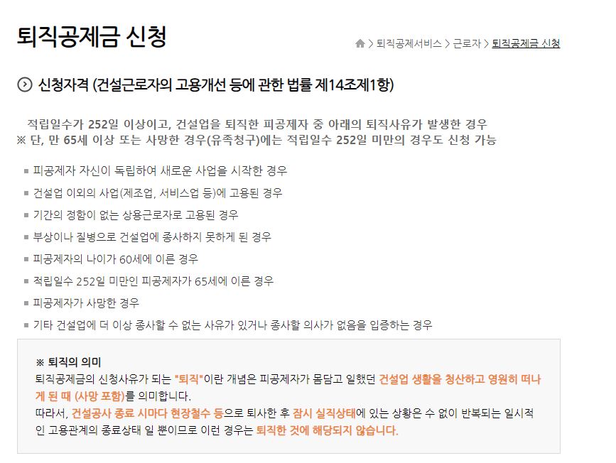 건설근로자 공제회에서는 건설근로자 고용개선을 위해 일정 자격을 충족한 경우 퇴직금을 신청할 수 있도록 했습니다.