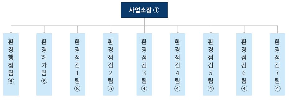 경기도광역환경관리사업소 조직도는 하단과 같으며 환경행정팀, 허가팀, 점검팀이 있습니다.