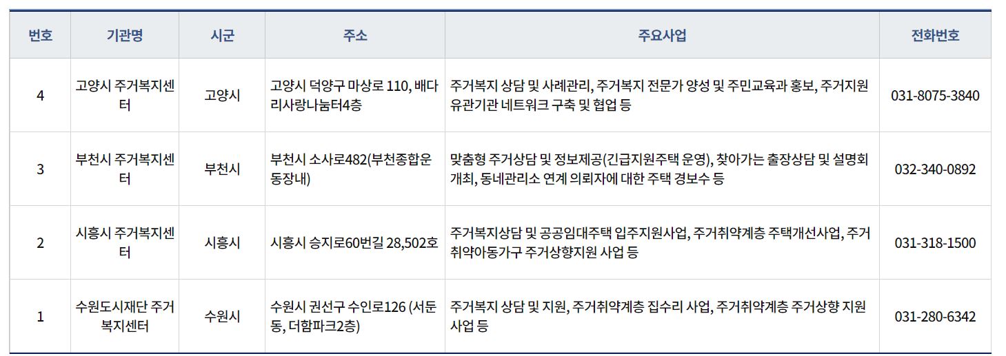 공공임대주택 찾기 서비스는 공고일, 지역, 유형, 공고명을 입력하고 검색하면 공고명, 공고일, 상태 열람이 가능하다. 경기주거복지포털 이용시 주거복지지원과 관련한 문의사항은 주거복지센터에 연락하면 된다. 고양시 주거복지센터, 부천시 주거복지센터, 시흥시 주거복지센터, 수원도시재단 주거복지센터가 있다. 하단에 기관명과 전화번호가 있으며 직접 방문을 해야하는 경우 기관의 주소를 참고하기 바란다. 고양시 주거복지센터의 경우 주거복지 상담 및 사례관리 업무, 부천시는 맞춤형 주거상담 및 정보제공, 시흥시는 주거복지 상담 또는 공공임대주택 입주지원사업, 수원도시재단은 주거복지 상담 및 지원업무를 하고 있으니 참고 바란다.