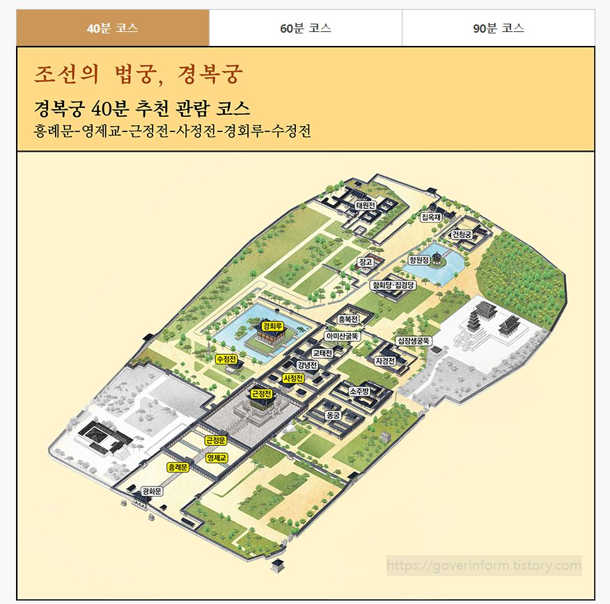 경복궁은 40/60/90분 코스가 있습니다. 시간을 먼저 정한 후에 어떤 코스로 갈지 살펴보면 됩니다. 90분코스는 흥례문을 시작으로 향원전까지 10곳을 둘러봅니다.