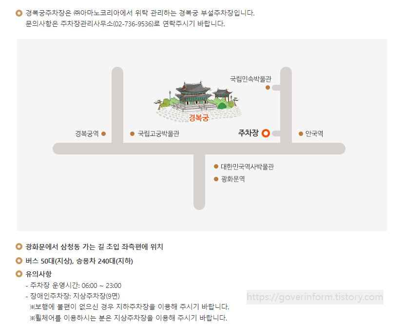 경복궁은 경복궁역. 광화문역. 안국역과 가깝습니다. 주차장은 오전 6시부터 저녁 11시까지 운영하고 있습니다.