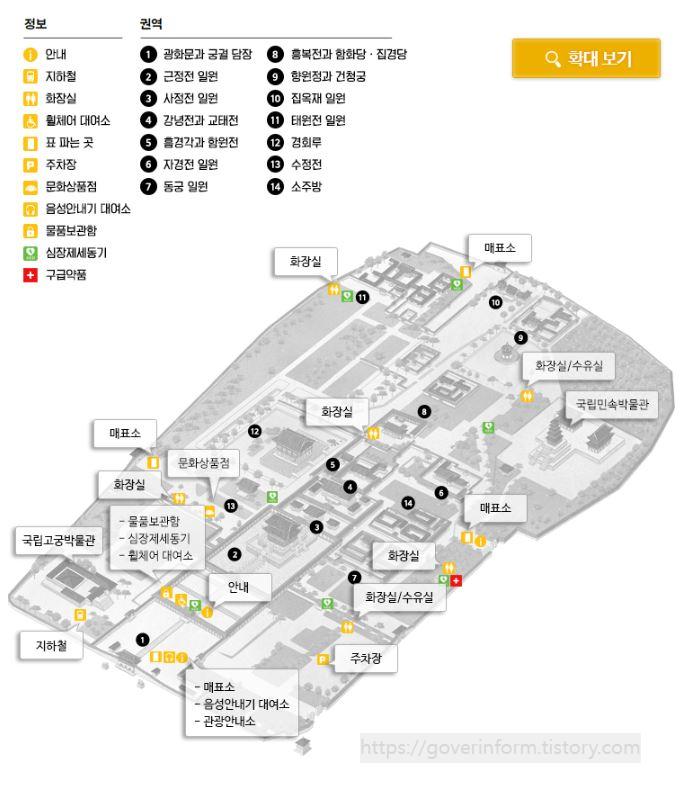 경복궁은 다음과 같이 매표소로 시작하여 광화문 궁궐담장. 근정전. 사정전. 강녕전. 동궁. 수정전. 경회루 등이 있습니다. 아래 지도를 참고하시면 경복궁 방문시 길을 헤메지 않을 수 있습니다.