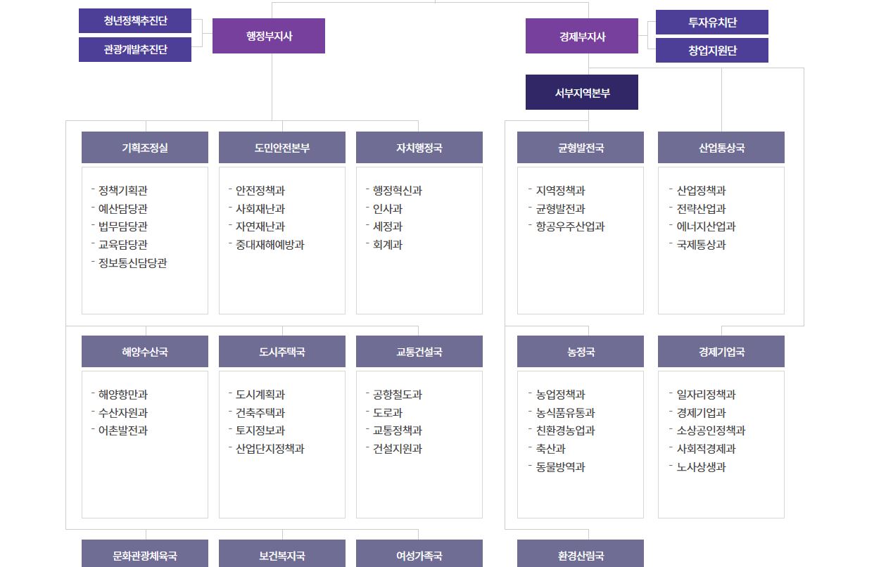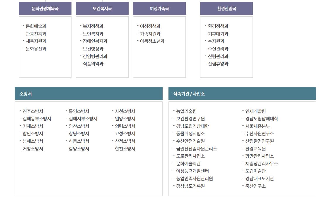 경상남도청 조직도입니다. 기획조정실, 도민안전본부, 자치행정국, 균형발전국, 산업동상국, 문화관광체육국 등이 있습니다. 진주 소방서 통영 소방서 등도 있네요.