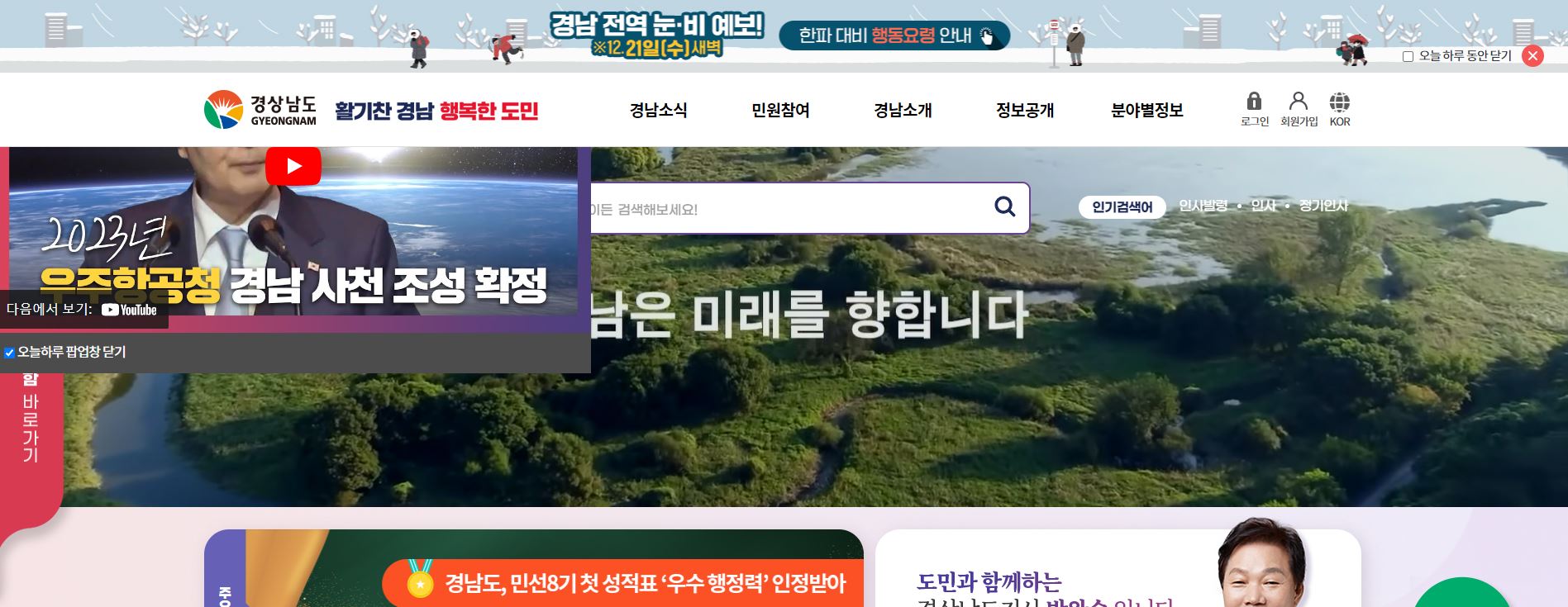 경상남도청 홈페이지입니다. 일반적으로 홈페이지 첫화면에는 주요 소식을 팝업창이나 한 눈에 보이게 주요 공지로 올려둡니다. 경상남도청에는 어떤 주요 소식이 있는지 볼까요? 바로 "2023년 우주항공청 경남 사천 조성 확정" 관련한 뉴스네요. 뉴스 자세히보기>https://www.gyeongnam.go.kr/index.gyeong