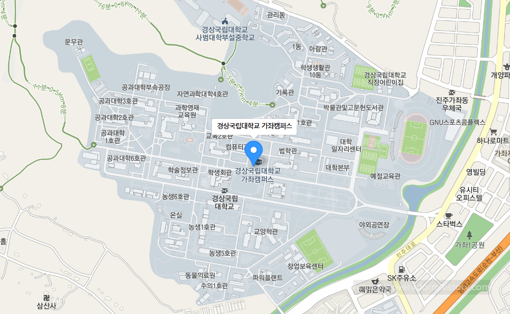 경상대는 여러군데에 캠퍼스가 있는데 아래는 가좌캠퍼스 지도입니다. 다른 캠퍼스 위치를 전체보기 원하는 분들은 아래 링크에서 확인하시면 됩니다. 경상대 캠퍼스(가좌,칠암,통영,창원산학,내동)