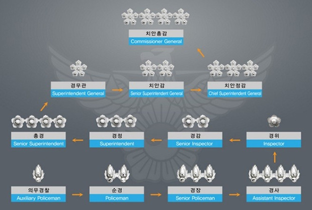 의무경찰을 시작으로 순경 경장 경사 경위 경감 경정 총경 경무관 치안감 치안정감 치안총감 순으로 되어있습니다.