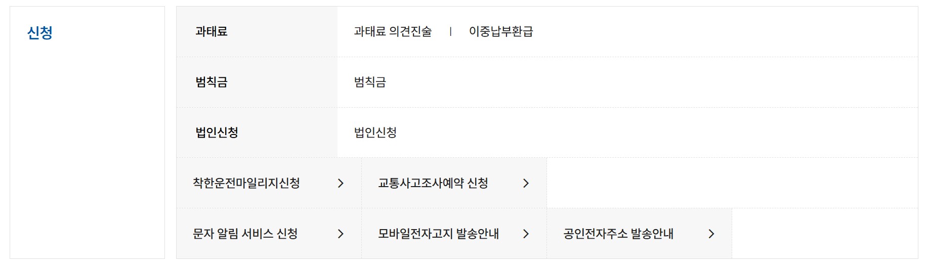 3. 신청: 과태료(과태료 의견진술ㅣ이중납부환급), 범칙금, 법인신청, 착한 운전마일리지신청, 교통사고조사예약 신청, 문자 알림 서비스 신청, 모바일전자고지 발송안내, 공인전자주소 발송안내