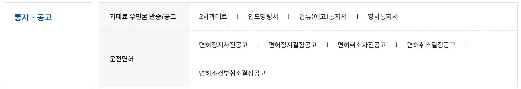 4. 통지 공고: 과태료 우편물 반송/공고: 2차 과태료ㅣ인도명령서ㅣ압류(예고) 통지서ㅣ영치통지서, 운전면허(면허정지사전공고ㅣ면허정지결정공고ㅣ면허취소사전공고ㅣ면허취소결정공고ㅣ면허조건부취소결정공고)