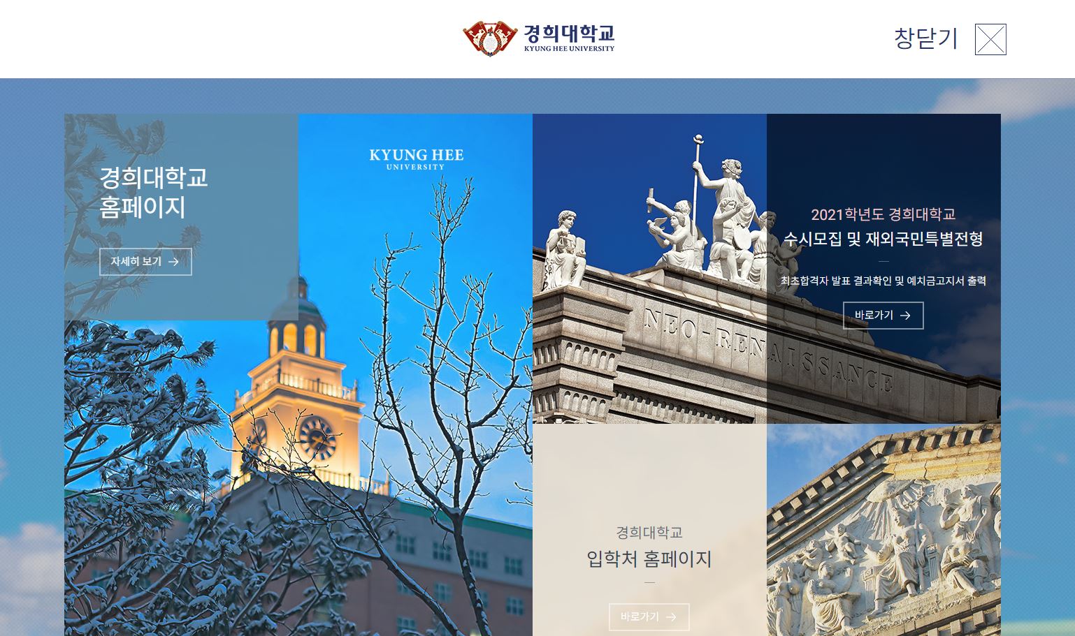 경희대학교 홈페이지의 첫 화면입니다. 로고가 바뀌었습니다.