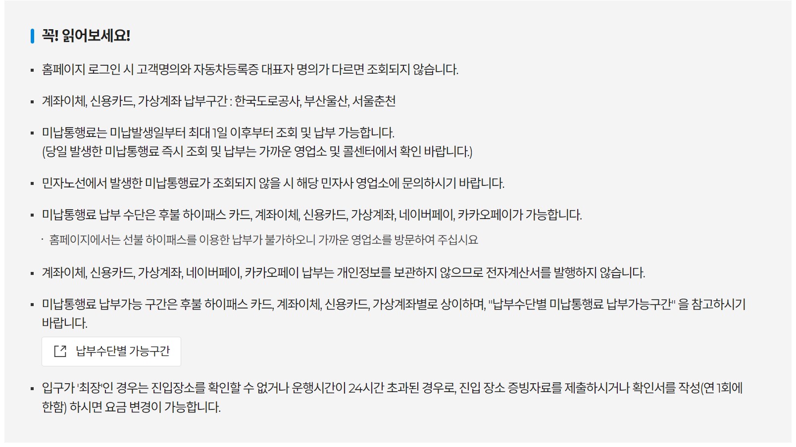 - 미납통행료 납부가능 구간은 후불 하이패스 카드, 계좌이체, 신용카드, 가상계좌별로 상이하며, 납부수단별 미납통행료 납부 가능구간을 참고 바랍니다. 납부 수단별 가능구간 조회하기 ☜