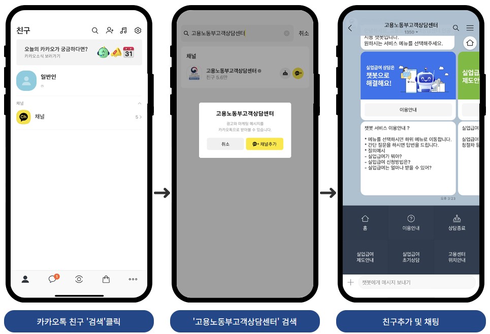 친구추가를 눌러 고용노동부고객상담센터를 대화친구로 추가합니다.