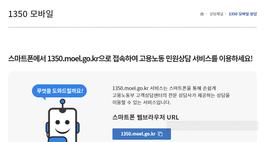 모바일상담은 스마트폰에서 1350.moel.go.kr으로 접속한후 전문 상담사와 상담을 하는 서비스입니다.