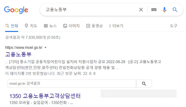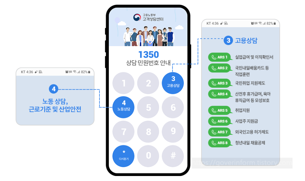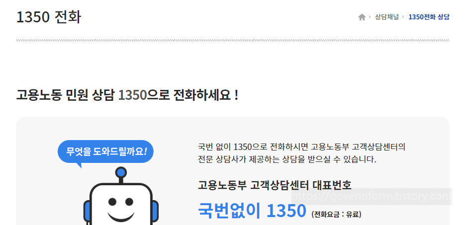고용노동부를 포털 검색창에 검색하면 검색결과 두번째쯤 1350 고용노동부 고객상담센터 홈페이지가 나옵니다. 여기에 접속하면 고용상담센터 전화번호 1350을 안내해줍니다. 굳이 홈페이지에 접속하지 않아도 바로 전화를 해도 됩니다. 전화연결후에도 상담원연결까지 많은 멘트를 들어야하는데요, 이런 번거로움을 덜고자 아래 꿀팁을 알려드려요.
