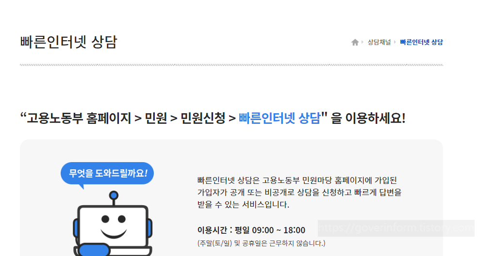 다음은 인터넷상담입니다. 인터넷 상담은 고용노동부 빠른인터넷 상담 서비스로, 공개 혹은 비공개로 상담을 신청하고 빠르게 답변을 받을 수 있는 서비스입니다.