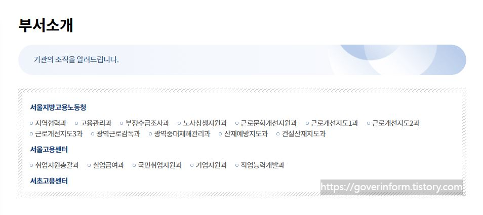 서울지방고용노동청, 서울고용센터, 서초고용센터 이렇게 세가지가 있는데 서울지방고용노동청에는 어떤 부서가 있는지 알아보겠습니다. 지역협력과, 고용관리과, 부정수급조사과, 노사생성지원과, 근로문화개선지원과, 근로개선지도1과, 2과, 3과, 광역근로감독과, 광역중대재해관리과, 산재예방지도과, 건설산재지도과가 있습니다.