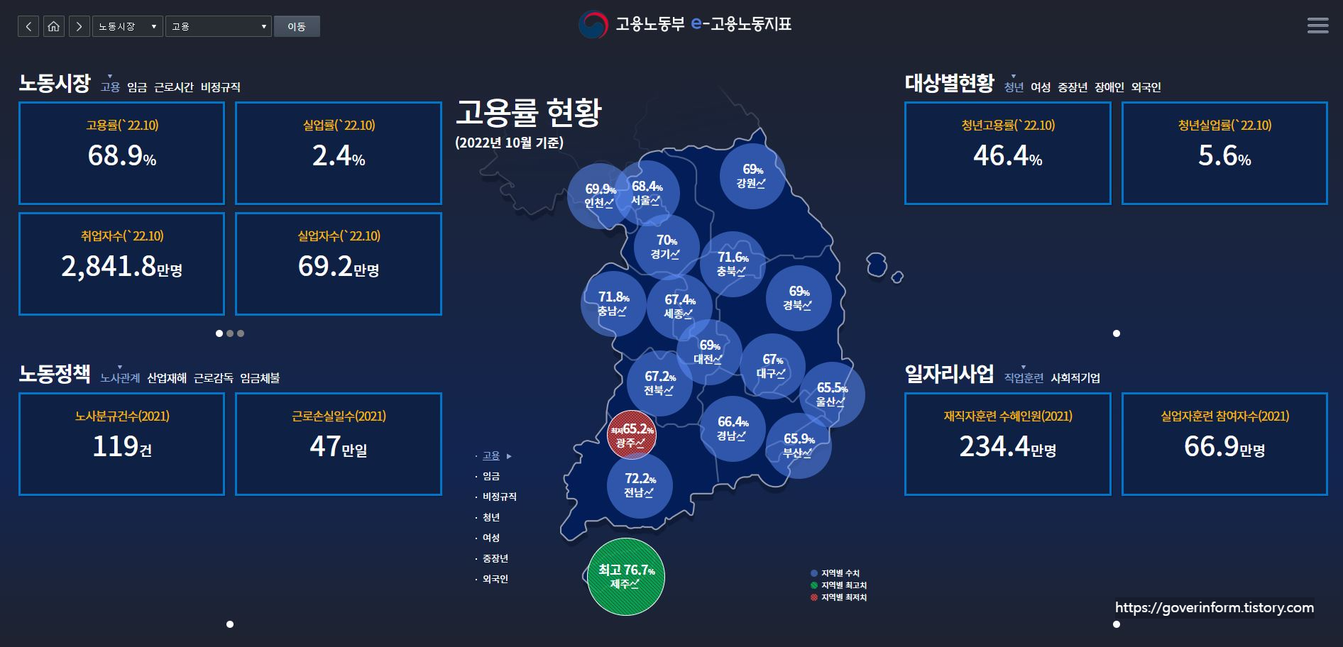 고용노동부 통계입니다. 고용률현황.대상별현황.일자리사업.노동시장과 정책이 있습니다. 지표가 궁금하신분들은 서울지방고용노동청 홈페이지 첫화면 하단에 있는 월별로 업데이트되는 고용노동부 통계를 참고하시기 바랍니다.