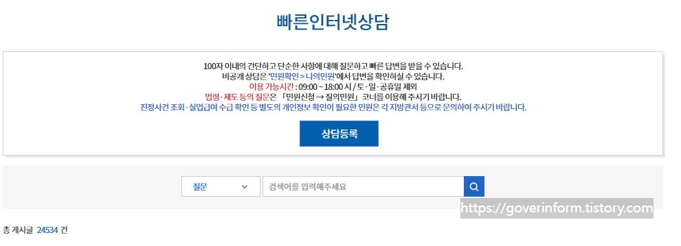 고용노동부에서 제공하는 빠른인터넷상담은 100자 이내로, 간단하게 질문을 입력하면 09:00~18:00 시간내에 상담원이 답변을 해줍니다. 빠른인터넷상담 바로가기