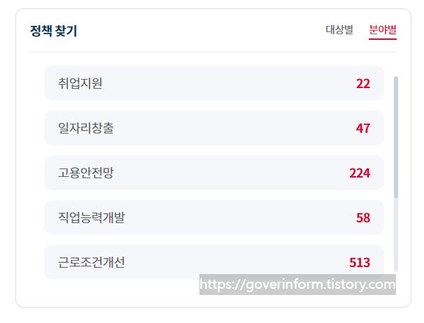 분야별에는 취업지원.일자리창출.고용안전망.직업능력개발.근로조건개선이 있습니다. 각각 22,47,224,58,513개의 정책이 있네요. 자세한 내용은 홈페이지 첫화면에 정책찾기가 있으니 이곳을 참고하시기 바랍니다.