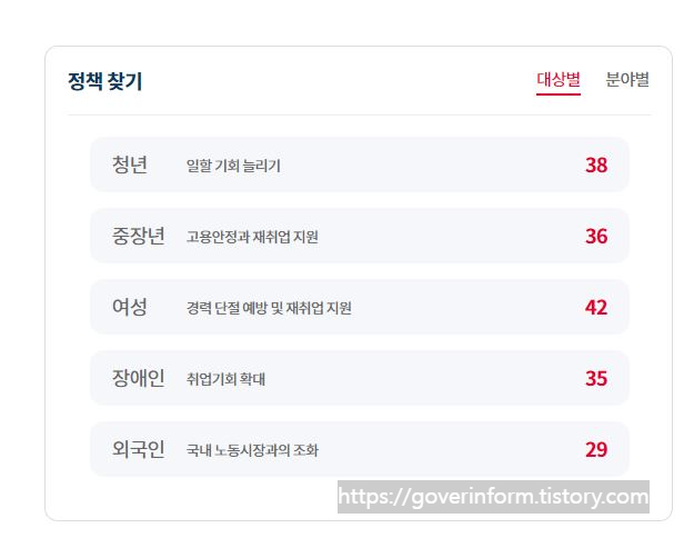 분야별에는 취업지원.일자리창출.고용안전망.직업능력개발.근로조건개선이 있습니다. 각각 22,47,224,58,513개의 정책이 있네요. 자세한 내용은 홈페이지 첫화면에 정책찾기가 있으니 이곳을 참고하시기 바랍니다.