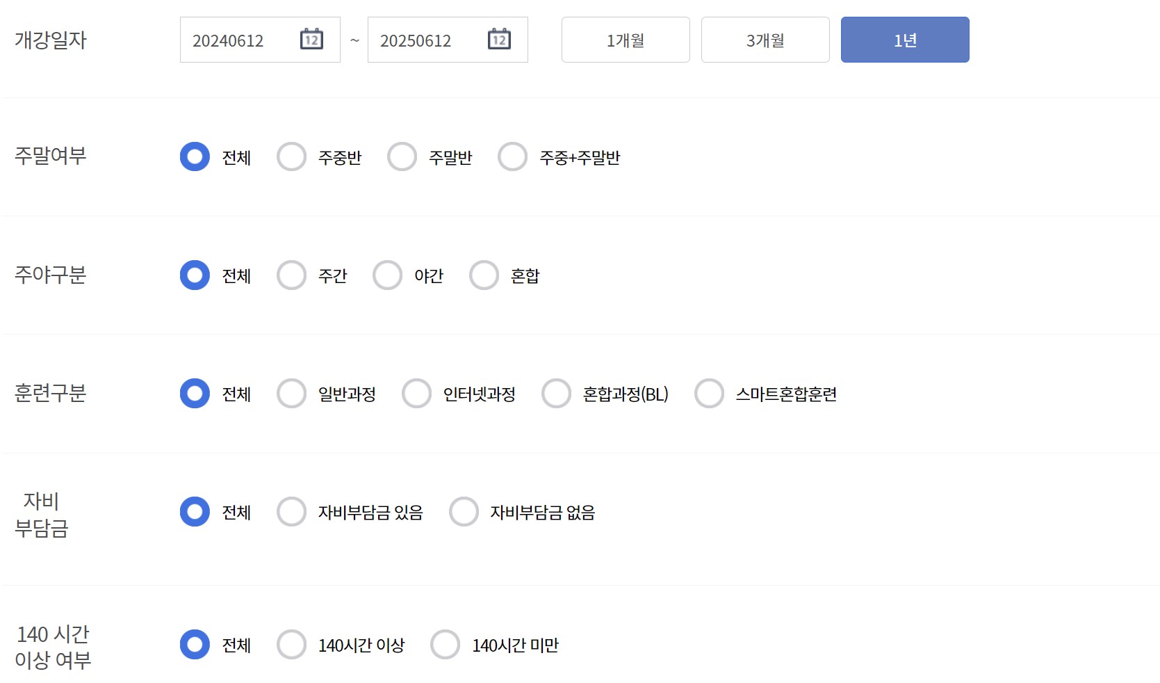 지역, 직종선택, 훈련유형과 같은 기본적인 사항은 물론 개강일자, 주말여부, 주야구분, 훈련구분, 자비부담금, 140시간 이상 여부, 직업능력개발 훈련시설 여부에 이르기까지 다양한 검색 조건을 선택하여 맞춤형 훈련 검색을 할 수 있습니다.