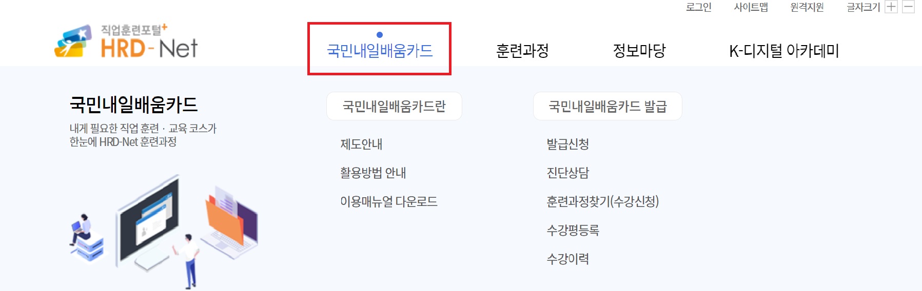 2. 메뉴에 있는 국민내일 배움 카드는 다양한 훈련을 배울 수 있는 카드로 취업준비생, 이직 희망자, 회사원, 중 장년, 경력 단절 여성들을 위한 직업 훈련 지원 카드입니다.