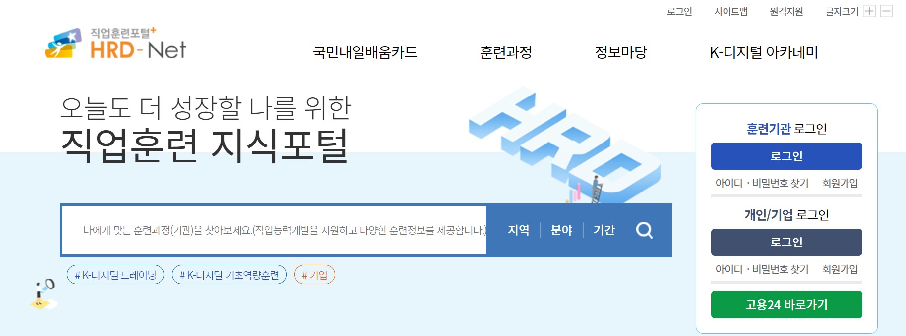 오늘도 더 성장할 나를 위한 직업훈련 지식포털 훈련기관 로그인 --> 훈련기관 로그인 로그인 개인/기업 로그인 로그인 고용24 바로가기