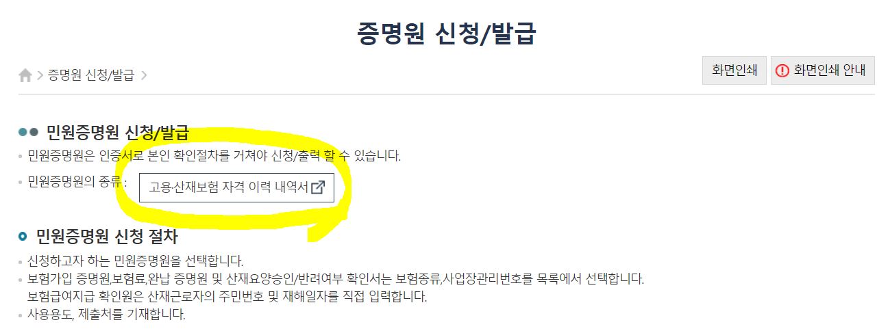 화면에서 고용 산재보험 자격 이력 내역서를 클릭하세요.
