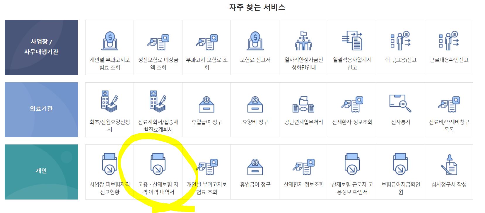 첫 화면 하단에 보면 개인 탭에 고용 산재보험 자격 이력 내역서가 있습니다.